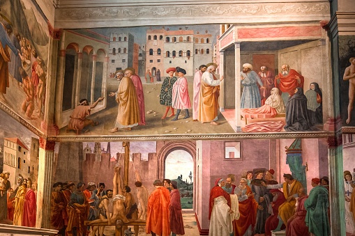 Chapelle Brancacci, Florence, où Masaccio et Masolino, les peintres de la lumière, exploitent les ombres et les éclairages pour façonner le relief et le modelé des personnages, quittant les représentations planes du gothique. Intérieurs emboîtés grâce à la perspective artificielle. Ce sont les nuances de la couleur plus que le trait qui font la forme. Scènes organisées en une série d'épisodes détachés, points de vue dans le point de vue. Par exemple la représentation des deux élégants personnages qui se promènent dans la rue, sans aucun rapport avec saint Pierre rescucitant Tabithe, accentue l'effet d'une juxtaposition des vues et d'un recadrage vu d'un point dissocié de celui des yeux du spectateur du miracle de saint Pierre.