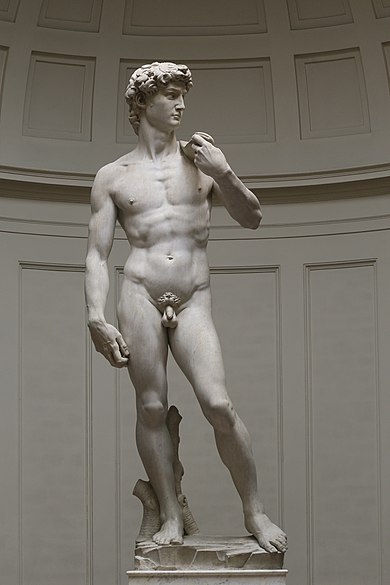 David, Michel-Ange, 1504. Le poids du corps sur une seule jambe, la ligne des hanches en opposition à celle des épaules, la jambe droite plus courte et la disproportion des mains accentue la dynamique et le geste.