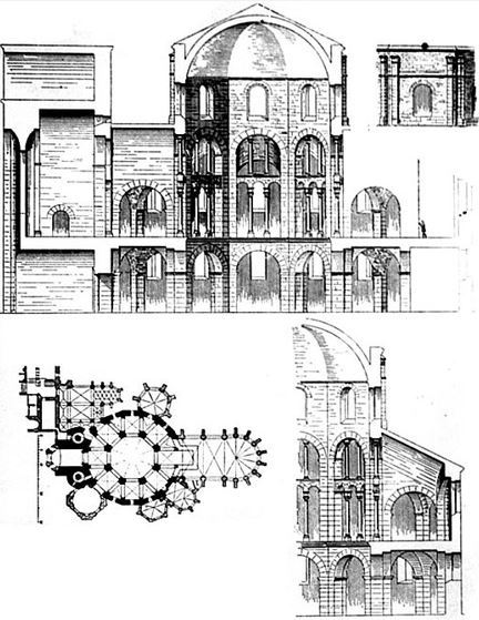 La chapelle palatine d'Aix, avec un octogone central et un pourtour hexadécagonal.